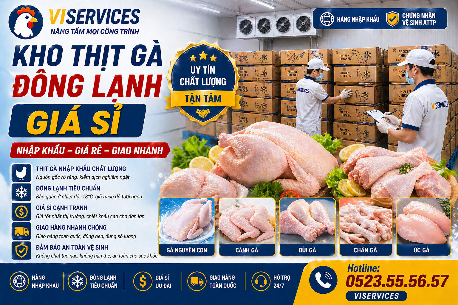Kho thịt gà đông lạnh giá sỉ, chuyên cung cấp gà nhập khẩu chất lượng, giá rẻ, giao nhanh toàn quốc, phù hợp nhà hàng, quán ăn, đại lý.